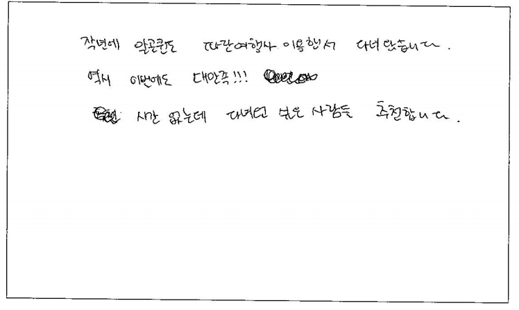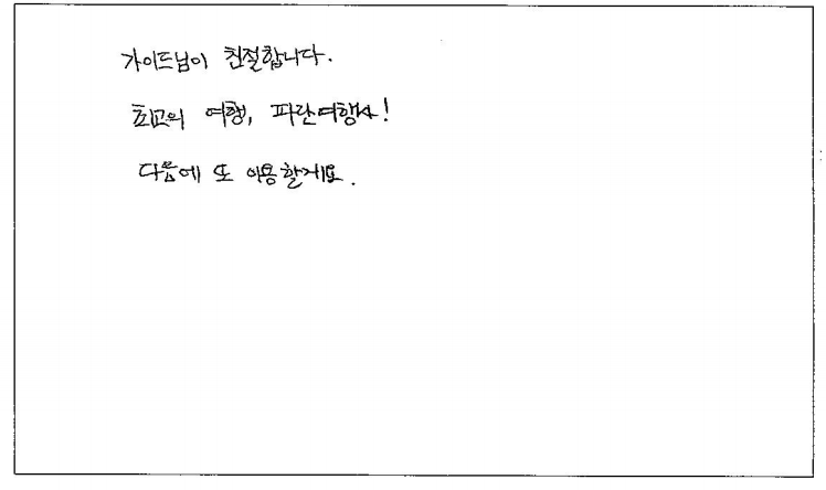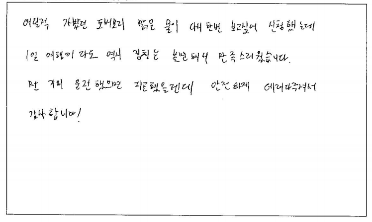 ![]() 어릴 적 가보았던 토버모리 맑은 물이 다시 한 번 보고싶어 신청했는데 1일 여행이라도 역시 경치는 볼만해서 만족스러웠습니다. 먼 거리 운전했으면 피곤했을텐데 안전하게 데려다주셔서 감사합니다! ![]() 작년에 알곤퀸도 파란여행 이용해서 다녀왔습니다. 역시 이번에도 대만족! 시간 없는데 다녀오고 싶은 사람들 추천합니다. ![]() 운전도 편안하고 스무스하게 해주시고 아주 편안한 여행이었습니다. 다음에 파란여행 다란 상품도 이용하려고합니다. ![]() 멀어서 렌트빌려도 가기 힘들었을텐데 너무 편안한 여행 좋아요! 강추합니다~ 가이드님도 너무 친절해요. ![]() 가이드님 친절합니다. 최고의 여행, 파란여행! 다음에 또 이용할게요. |