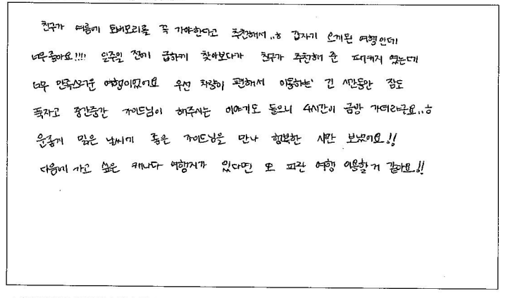 ![]() 토론토에서 지내면서 토버모리를 여름에 꼭 가보고싶었는데 이동시간이 차로 4시간이상이라 망설이고 있었던 참에 파란여행 토버모리 1일투어가 있다는 것을 알게되었어요! 덕분에 여름이 지나기 전에 편하고 즐겁게 여행하고 왔습니ㅏㄷ! 오전 일찍 출발이라 피곤할까봐 걱정했는데 이동하는 4시간 내내 꿀잠잤네요 가이드님 운전실력 짱! 차량도 운좋게 저희 일행 포함 4명이라 자리도 쾌적해서 멀미도 안했어요. 저희는 꽃병섬 들어가는 선택투어를 하지 않아서 그냥 유유자적 산책하려고 했는데 가이드님이 심심할 거라며 코스도 짜주셔서 긴 자유시간 알차게 보냈습니다! 추천해주신 스팟에서 피크닉했던 시간이 이번여행 최애 순간이었어요 생각보다 너무 만족스러운 여행이었어서 곧 다가올 가을 퀘벡 단풍여행까지 고민중입니다 파란여행 짱! P.S 이동시간에 해주시는 이야기들이 너무재밌어요 ㅎㅎ 옆에 지나가는 마차 스토리가 인상적이었습니다!) ![]() 토버모리까지 먼 길 편하게 여행올 수 있어서 감사했습니다. 기억에 남는 데이트가 될 것 같아요~ 제가 운전하지 않고 제가 했더라면 헤메고 힘들었을거에요! 긴 시간 지루하지 않게, 또 안전하게 가이드님의 안내를 받으며 즐겁게 여행했습니다. 유람선은 선택이 아니고 필수입니다. (추천) 꽃병섬도 예뻤지만 가라앉는 난파선들을 1m도 채 안되는 수심거리에서 볼 수 있어 신기했고 물이 맑고 투명해서 내내 신기하고 좋았습니다! 도시락도 나름 괜찮았고 매노나이트 직접 볼 수 있어 또 신기하고 귀중한 경험했네요. 가이드님, 친절하고 안전한 가이딩 감사했습니다. ![]() 친구가 여름에 토버모리를 꼭 가야한다고 추천해서 갑자기 오게된 여행인데 너무 좋아요!! 일주일 전에 급하게 찾아보다가 친구가 추천해 준 패키지이었는데 너무 만족스러운 여행이었어요. 우선 차량이 편해서 이동하는 긴 시간동안 잠도 푹자고 중간중간 가이드님이 해주시는 이야기도 들으니 4시간이 금방 가더라구요 운좋게 맑은 날씨에 좋은 가이드님을 만나 행복한 시간 보냈어요! 다음에 가고 싶은 캐나다 여행지가 있다면 또 파란여행 이용할 거 같아요! ![]() 토론토 1일 관광 상품을 찾아보다가 파란여행을 알게 되었는데 다양한 상품이 많이 진행중이라 고민이 많이 되었어요. 케네디언 친구에게 물어보니 토버모리를 추천해줘서 방문하게 되었습니다. 9월 방문인데 날씨도 좋고, 소규모 투어로 잘 즐기고갑니다. 꽃병섬 너무 좋았어요 ![]() 우연히 구글 검색한 파란여행! 너무 좋았어요! 당일여행으로 가서 짧을 줄 알았는데 굵게 다녀왔어요 가이드님이 토버모리에 대한 설명도 해주시고, 안내도 잘 해주시고, 시간 약속도 잘 지켜서 바로바로 척척 편하게 여행할 수 있었어요 파란여행 최고! |