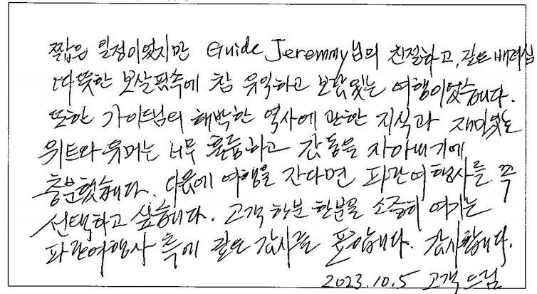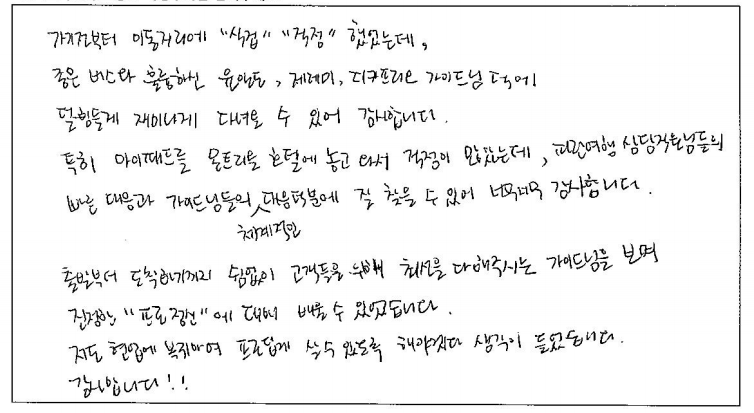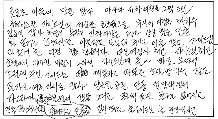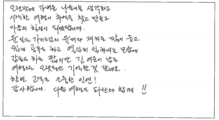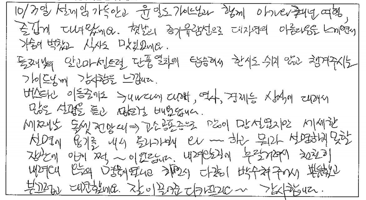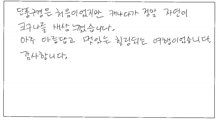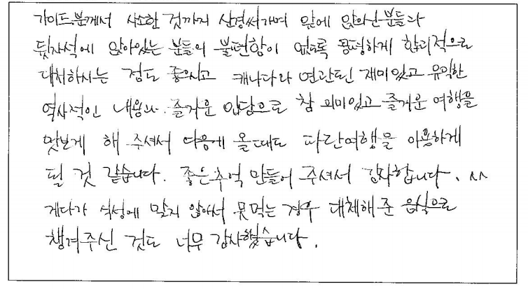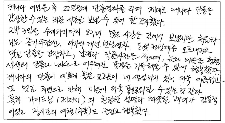 ![]() 여행사하면 파란여행이라는 소문을 들었지만 직접 체험해보니 정말 손님을 위하여 최선을 다한 모습이 보였습니다. 만족, 대만족입니다. 음식도 좋았고, 호텔도 좋았고, 가이드의 안내는 정말 프로급 수준입니다. 감사합니다. 파란여행을 적극 추천하고 홍보하여야 되겠다는 생각이 들었습니다. 파란여행 최고, 가이드님 최고입니다. ![]() 단풍구경은 처음이었지만 캐나다가 정말 자연이 크구나를 새삼느꼈습니다. 아주 아름답고 멋있는 힐링되는 여행이었습니다. 감사합니다. ![]() 토론토 아들네 방문 왔다. 아가와 기차 여행 2박 3일 유머러스한 가이드님의 세심한 보살핌으로 무사히 여행을 마칠 수 있음에 감사하면서 솔직히 기차여행은 제가 상상 했던 만큼 와닿지는 않았지만 이것 저것 보살펴 주시는 아들 같은 가이드님과 함께 한 여행 행복했습니다. 파란여행 최고 가이드님 최고 호텔에서 에어컨바람이 나와서 가이드님께 콜~ 바로오셔서 조절해주신 가이드님 깨끗하고 따뜻한 호텔방에서 잠도 잘자고 여러가지로 감사합니다. 알곤퀸 공원 단풍 전망대에서 펼쳐지는 단풍파노라마를 보면서 감동 그리고 말로써 표현할 수가 없을 정도로 정말 좋았습니다. 감사합니다. 늘 가이드님 늘 건강하시고. ![]() 10/3일 설레임과 가득안고 윤일도 가이드님과 함께 아가와 캐년 여행 즐겁게 다녀왔네요. 첫날의 증기유람선으로 대자연의 아름다움을 느끼면서 가슴이 벅찼고 식사도 맛있었네요 둘째 날의 알고마 센트럴 단풍열차에 탑승해서 한시도 쉬지 않고 챙겨주시는 가이드님께 감사함을 느낍니다. 버스타고 이동중에도 캐나다에 대해, 역사, 경제등 상식에 대해서 많은 설명을 듣고 많은 것을 배웠답니다. 셋째날 돌셋전망대 -> 고소공포증으로 많이 망설였지만 세세한 설명에 용기를 내서 올라가보니 와~~~하고 뭐라 설명하지 못할 장관에 입이 쩍~ 벌어졌답니다. 내려오는길에 떨면서 천천히 내려오니 오늘의 명물이였다고 하면서 다같이 박수쳐주어서 뿌듯했고 부끄럽고 대견했네요 잘 이끌어준 가이드님~ 감사합니다. ![]() 캐나다 이민온 후 22년만에 단풍열차를 타며 제대로 캐나다 단풍을 감상할 수있는 귀한 시간을 보낼 수 있어 참 감사했다. 2박3일을 수세마리까지 오가며 많은 시간을 길에서 보냈지만 처음타보는 증기유람선, 아가와 캐년 관광열차. 돌셋 전망대를 오르내리고 멋진 단풍을 감상하고 남편과 작품사진을 찍으며 눈과 마음을 형형색색의 단풍과 강으로 어우러진 풍경을 가득채울 수 있어 행복했다. 캐나다의 단풍이 예쁘게 물든 요즘 내 생일까지 있어 더욱 아름답고 또 멋진 자연으로 인해 마음이 더욱 풍요로워질 수 있는 것 같다. 특히, 가이드님의 친절한 설명과 따뜻한 배려가 감동적이었고 장시간의 여행도 즐겁고 행복했다. ![]() 가이드분께서 사소한 것 까지 신경써가며 앞에 앉으신분들과 뒷좌석에 앉아있는 분들의 불편함이 없도록 공평하게 합리적으로 대처하시는 점도 좋으시고 캐나다와 연관된 재미있고 유익한 역사적인 내용과 즐거운 입담으로 참 의미있고 즐거운 여행을 맛보게 해주셔서 다음에 올 때도 파란여행을 이용하게 될 것 같습니다. 좋은 추억 만들어주셔서 감사합니다 게다가 식성에 맞지 않아서 못 먹는 경우 대체해 준 음식으로 챙겨주신 것도 너무 감사했습니다. ![]() 가기전부터 이동거리에 '식겁', '걱정' 했었는데, 좋은 버스와 훌륭하신 가이드님덕분에 덜 힘들게 재밌게 다녀올 수 있어 감사합니다. 특히, 아이패드를 몬트리올 호텔에 놓고와서 걱정이 많았는데 파란여행 상담직원님들의 빠른 대응과 가이드님들의 체계적인 대응 덕분에 잘 찾을 수 있어 너무 너무 감사합니다. 출발부터 도착하기까지 쉼없이 고객들을 위해 최선을 다해주시는 가이드님을 보며 진정한 "프로정신"에 대해 배울 수 있었습니다. 저도 현업에 복귀하여 프로답게 살 수 있도록 해야겠다는 생각이 들었습니다. 감사합니다! ![]() 짧은 일정이었지만 가이드님의 친절하고, 깊은 배려심 따뜻한 보살핌속에 참 유익하고 보람있는 여행이었습니다. 또한, 가이드님의 해박한 역사에 관한 지식과 재미있는 위트와 유머는 너무 훌륭하고 감동을 자아내기에 충분했습니다. 다음에 여행을 간다면 파란여행을 쭉 선택하고 싶습니다. 고객 한 분 한 분을 소중히 여기는 파란여행측에 깊은 감사를 표합니다. 감사합니다. ![]() 오랜만에 가벼운 나들이를 생각하고 시작한 여행이 추억을 찾고 만들고 마음의 힐링이 되었답니다. 가이드님의 유머와 재치로 많이 웃고 쉽게 공부도 하고 열심히 일하시는 모습에 감동도 하는 짧지만 긴 여운이 남는 여행으로 오랫동안 기억할 것 같네요. 한 번 고객은 소중한 인연! 감사합니다. 다음 여행도 파란과 함께! |