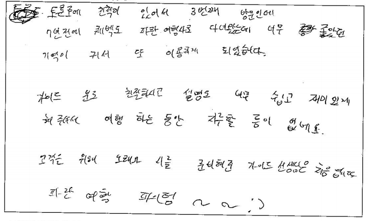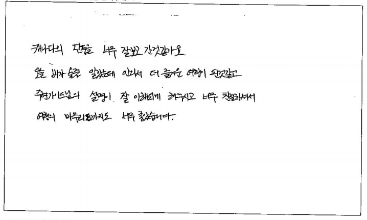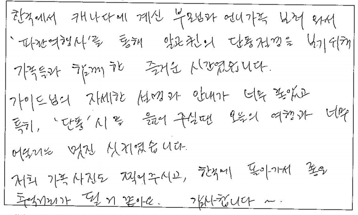 제목 | 2023년10월05일 출발 무스코카+알곤퀸1일 자필후기 | ||