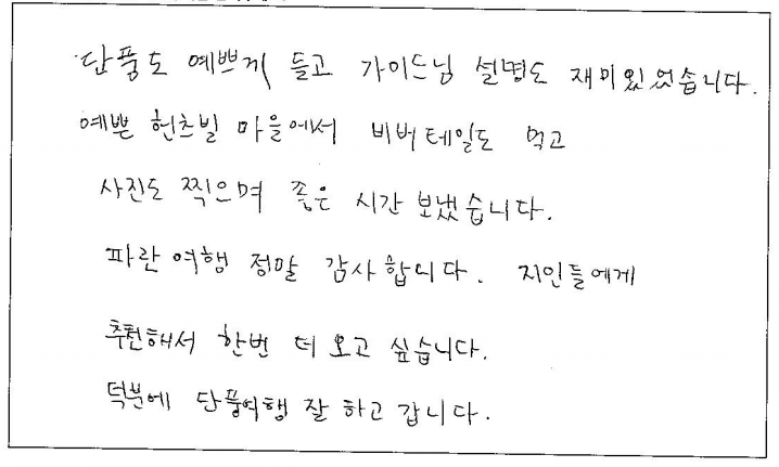 ![]() 알곤퀸의 단풍이 너무 이뻤어요 가이드님이 너무 잘 설명해주시고 친절하셔서 정말 좋았습니다. 제가 만나본 몇안되는 자세하고 좋은 설명해주시는 분이셨어요. 좋은 여행하게 해주셔서 감사합니다~ ![]() 캐나다의 단풍을 너무 잘보고 간 것 같아요. 오늘 비가 올 줄 알았는데 안와서 더 즐거운 여행이 된 것 같고 가이드님의 설명이 잘 이해되게 해주시고 너무 친절하셔서 여행의 마무리까지도 너무 좋았습니다. ![]() 어쩌면 인생의 마지막이 될감동스런 단풍을 보고 갑니다. 이런 광경은 하나님이 만드셨지만 이것을 감상할 수 있게 해준 파란여행과 가이드님께 감사합니다. ![]() 단풍도 예쁘게 들고 가이드님 설명도 재미있었습니다. 예쁜 헌츠빌 마을에서 비버테일도 먹고 사진도 찍으며 좋은 시간 보냈습니다. 파란여행 정말 감사합니다. 지인들에게 추천해서 한 번 더 오고싶습니다. 덕분에 단풍여행 잘 하고갑니다. ![]() 토론토에 친척이 있어서 3번째 방문인데 7년전에 퀘벡도 파란여행으로 다녀왔는데 너무 좋았던 기억이 되서 또 이용하게 되었습니다. 가이드 분도 친절하시고 설명도 너무 쉽고 재미있게 해주셔서 여행하는 동안 지루할 틈이 없네요. 고객을 위해 노래와 시를 준비해준 가이드 선생님은 처음입니다. 파란여행 파이팅~~ :) ![]() 곱게 물든 단풍처럼 나도 아름답게 내려놓을 준비를 해야겠다. 오래도록 기억에 남을만한 의미있는 단풍여행 상품을 기획해주신 파란여행 고맙습니다. ![]() 가이드님의 단풍여행에 맞는 단풍시도 읽어주셔서 매우 감상적이며 감동이었어요 열심히 설명해주시는 모습에 박수보냅니다. 파란여행과 기사 가이드님께 감사드려요. 차량 만족입니다. ![]() 한국에서 캐나다에 계신 부모님과 언니 가족 보러와서 '파란여행'을 통해 알곤퀸의 단풍절경을 보기 위해 가족들과 함께한 즐거운 시간이었습니다. 가이드님의 자세한 설명과 안내가 너무 좋았고 특히, '단풍'시를 읊어 주실 땐 오늘의 여행과 너무 어울리는 멋진 시구였습니다. 저희 가족사진도 찍어주시고, 한국에 돌아가서 좋은 추억거리가 될 거 같아요. 감사합니다~ |