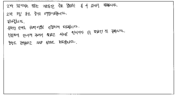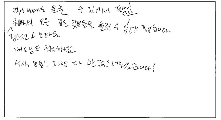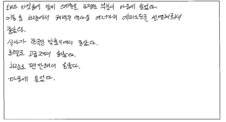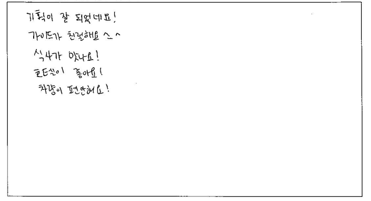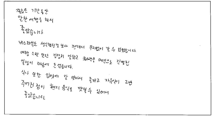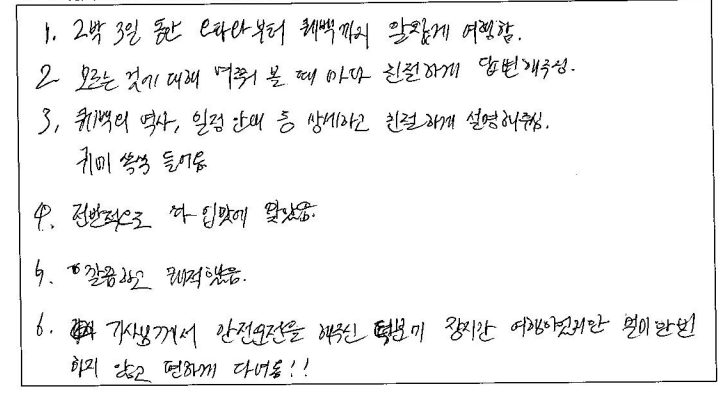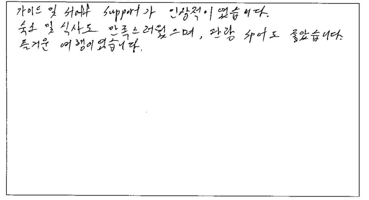 ![]() 파란여행 덕분에 2박3일 알찬 여행이 되었습니다. 감사합니다! 패키지여행은 처음이라 걱정됐지만 알찬 스케줄, 넉넉한 자유시간 보장으로 편안하게 여행 할수 있었습니다. 가이드님의 설명 덕분에 오타와가 수도로 지정된 이유, 여러가지 역사 또는 스토리를 들을 수 있어 흥미로웠습니다! 그리운 한식을 여행 내내 밋볼 수 있어 더 에너지를 충전할 수 있었고 퀘벡에서의 호텔은 너무나도 좋은 위치에 있어 편리했습니다. 화장실을 사용할 수 없다는 점이 아쉽지만 그 만큼 휴게소를 들러 화장실 갈 시간을 보장해 주셔서 긴 여행 무사히 마칠 수 있었습니다. 감사합니다! ![]() 2박3일 여러 곳을 알차게 다닐 수 있는 여행 상품이라 좋았습니다. 가이드님이 꼼꼼히 설명해 줘서 좋았어요. 식사는 한식으로 부족하지 않게 나와서 좋았습니다. 호텔은 깨끗하고 넓어서 여러명이 같이 사용하기에 부족함이 없었습니다. 운전도 안전하게 해주시고 친절하게 대해주셔서 차량이동에 만족합니다. ![]() 소비자 타켓층에 맞게 스케쥴을 조정한 부분이 맘에 들었다. 이동 중 차량에서 퀘벡의 역사 등 여러가지 에피소드를 설명해줘서 좋았다. 식사가 한국인 맞춤이어서 좋았다. 호텔도 고급지고 차량도 편안해서 좋았다. 마음에 들었다. ![]() 기획이 잘 되었네요! 가이드가 친절해요 ^_^ 식사가 맛나요! 호텔이 좋아요! 차량이 편안해요! ![]() 기획이 훌륭! 식사 만족! 가이드님 열정 최고! 일정 최고! ![]() 2박3일이라는 짧은 기간동안 주요 명소들을 볼 수 있어서 좋았습니다. 2박3일 동안 즐거운 여행이었습니다. 감사합니다. 유학원 소개로 퀘벡 여행을 신청하게 되었습니다. 친절하게 안내해 주셔서 좋았고 식단은 한식이라 더 좋았던 것 같습니다. 호텔도 괜찮았고 챠량 상태도 좋았습니다. ![]() 짧은 기간동안 알찬 여행을 해서 좋았습니다. 버스 좌석도 생각했던것 보다 편해서 무리없이 갈 수 있었습니다. 여행 스팟 또한 굉장히 알차고 퀘벡을 메인으로 진행된 일정이 마음에 들었습니다. 식사 또한 입맛에 잘 맞아서 좋았고 자유식이 2번 주어진 점이 현지 음식을 맛볼 수 있어서 좋았습니다. ![]() 역사 이야기도 들을 수 있어서 좋았습니다. 킹스턴, 오타와, 퀘벡의 모든 좋은 곳들을 들릴 수 있어 좋았습니다. 가이드님 친절하시고 식사, 호텔, 차량 다 만족스러웠습니다! ![]() 가이드 및 Staff Support가 인상적이었습니다. 숙소 및 식사도 만족스러웠으며 관광 스팟도 좋았습니다. 즐거운 여행이었습니다. ![]() 1. 2박3일 동안 오타와 부터 퀘벡까지 알차게 여행함. 2. 모든것에 대해 여쭤 볼때 마다 친절하게 답변 해주심. 3. 퀘벡의 역사, 일정 안내 등 상세하고 친절하게 설명해주심. 귀에 쏙쏙 들어옴 4. 전반적으로 다 입맛이 맞았음. 5. 깔끔하고 쾌적했음. 6. 기사님께서 안전운전을 해주신 덕분에 장기간 여행이었지만 멀미 한번 하지 않고 편하게 다녀옴!! |