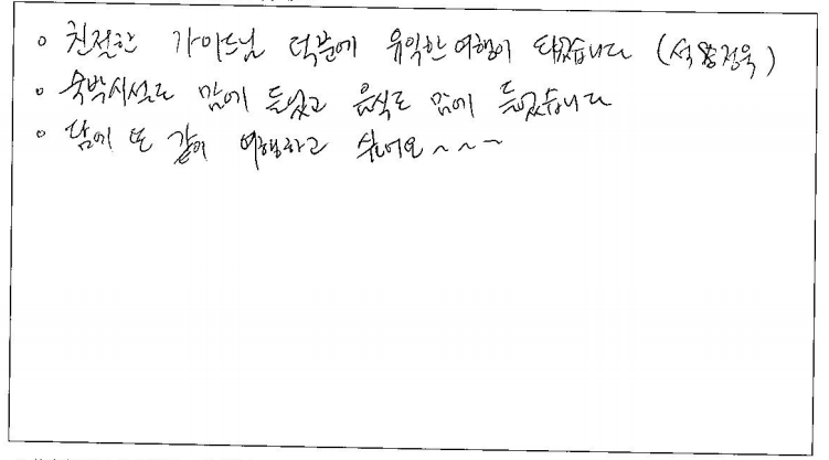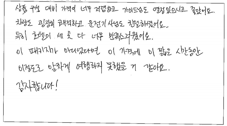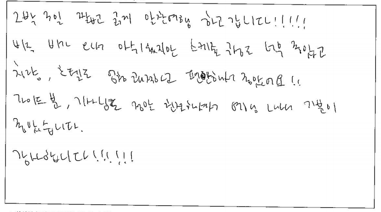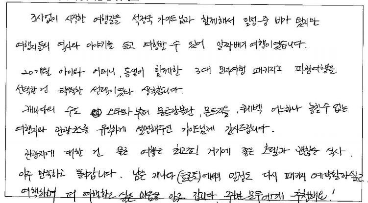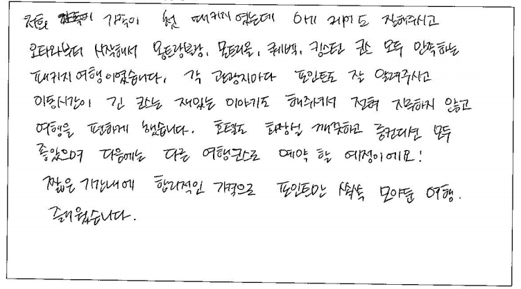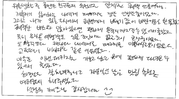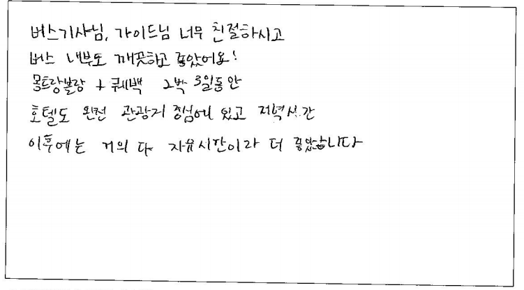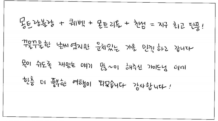 제목 | 2023년10월10일 출발 퀘벡+몽트랑블랑 자필후기(3-1호차) | ||