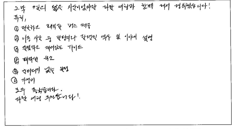 ![]() 제 나이 올해로 30살! 태어나서 처음으로 혼자여행에 도전해 보았습니다. 얼마전 토론토로 워홀을 와서 칙칙하고 삭막한 겨울에 살짝 우울해서 떠난 퀘벡여행은 제게 다시 활기를 찾게 해주었습니다 여기서 처음 뵌 다른 여행객분들과 서로 사진도 찍어주고 저녁에 와인도 함께 마시며 2박3일동안 굉장히 즐거운 시간을 보낼 수 있어서 행복했습니다 모든 여행장소(특히 도깨비)숙소 대박 좋았습니다. 파란여행을 통해 퀘벡여행은 정말 최고의 선택이었다고 자랑했습니다. 언젠가 다시 여름/가을의 퀘벡을 보러 오는 것이 버킷리스트 중 하나가 되었습니다. 재밌는 이야기도 해주시며 안전하게 이끌어주신 가이드님과 스윗하게 안전운전해 주신 기사님께도 감사드립니다! ![]() 2번째로 Quebec에 여행을 갔는데 아주 편리해서 대만족입니다. 가이드님이 재미있으시고 여행의 소중함도 알게 되었습니다. 기사님도 아주 친절하십니다. 특히 제가 이 여행에서 제일로 만족했던 것은 바로, "자유시간"입니다. 딱! 적절하게 자유시간을 주셔서, 아주 자유롭습니다. 다음에 또 파란여행사로 오고싶네요. 친구도 만들고 추억도 만들고 지식도 만들고! 3달이 빨리 가네요. 2박 3일 동안 모두들 수고 많으셨고, 특히 가이드님과 기사님도 수고 많으셨습니다. ![]() 자유 여행을 선호하는 제가 '다음에도 패키지 여행을 가볼까?'라고 생각이 들만큼 훌륭한 일정이었습니다. 맛있는 식사와 안전한 운전 무엇보다 고객의 편의를 많이 배려해 주신 가이드님 최고입니다. 파란여행 더욱 번창하시길 바랍니다 :) ![]() 혼자 패키지 여행은 처음이라 걱정했는데, 좋은 분들을 많이 만나게 되었고 즐겁고 소중한 추억들을 많이 만들 수 있었습니다. 가이드님도 너무 친절하시고 유머러스하셔서 여행이 더욱 즐거웠어요! 이번 여행을 계기로 패키지여행과 혼자 여행에 대한 많은 깨달음을 얻었고 앞으로 또 파란여행 이용할 계획입니다! 소중한 추억 만들어주셔서 감사해요 :) ![]() 2박 3일간 예쁘고 멋있는 퀘벡에서 즐거운 추억 많이 만들고 갑니다. 가이드님이 심심하지 않게 재밌고 유익한 정보를 너무 많이 주셔서 감사했습니다. 친구들과 소중한 추억, 예쁜 사진 건질 수 있게 해주셔서 감사합니다 :) ![]() 여행지의 소개뿐 아니라 캐나다의 역사를 배우게 되는 계기가 되어 좋은 경험이었습니다. 어린 조카랑 여행왔는데 한식으로 음식이 준비되어 한국에서 온 어린조카도 문제 없이 좋은 시간을 보낼 수 있었습니다. 3번째 오는 패키지 여행 코스였는데 새롭고 즐거운 시간이었습니다. ![]() 2박 3일의 짧은 시간이었지만 파란여행과 함께해서 행복했습니다! 특히, 1. 편안하고 쾌적한 버스 제공 2. 이동시간 중 관광지와 관련된 역사 및 이야기 설명 3. 친절하고 재미있는 가이드 4. 쾌적한 버스 5. 군더더기 없는 일정 6. 가성비 모두 좋았습니다. 파란여행 추천합니다! ![]() 소중한 추억을 만들고 갑니다. 친구와 함께 행복하고 영원히 잊지못 할 여행이었습니다. 친절하고 미남이신 가이드님의 지역설명과 더불어 쓸데없는 쇼핑스케쥴이 전혀 없어서 더욱 즐거운 여행이었습니다. 파란여행 화이팅!!! ![]() 너무나도 즐겁고 재미있는 2박 3일 캐나다 퀘벡 여행이었습니다! 가이드님 너무 열정적이시고 퀘벡 여정 내내 설명도 너무 잘해주시고 덕분에 알찬 여행이었네요! 식사뿐만 아니라 숙소도 너무 만족스러웠고 오타와, 몬트리올 그리고 퀘벡 시티까지 곳곳을 둘러보며 즐길 수 있는 잊지 못할 특별한 여행이었습니다. 좋은 추억 만들어주셔서 너무나도 감사드립니다 :) |