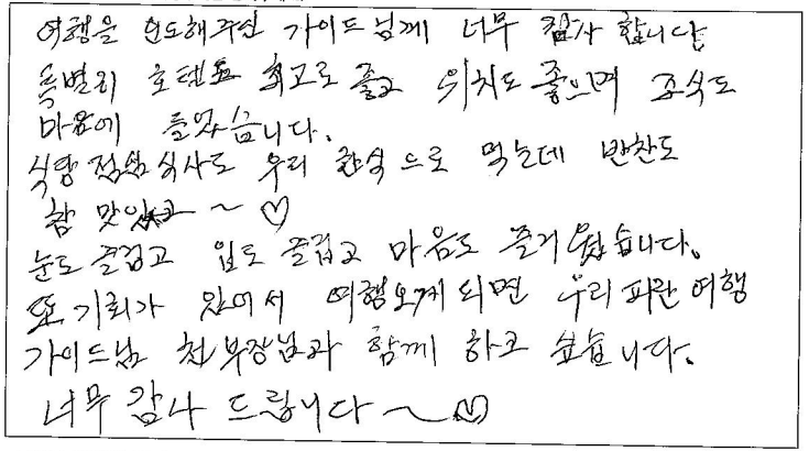 ![]() 다운타운 중심지에 위치한 5성급 호텔, 너무너무 맛있는 식사(특히 호텔 조식!!!) 편안하고 넓찍한 차량, 센스있고 재밌게 안내해주시는 가이드분까지 모든 게 완벽한 여행 만들어주신 파란여행에 감사드립니다! 다음에 무조건 다시 이용할 것 같아요 ![]() 2박 3일동안 덕분에 잘 즐기고 갈 수 있었습니다 :) 호텔이 다운타운에 위치해서 투어가 끝나고 나서도 개인적으로 주변을 더 둘러볼 수 있는 기회가 생겼던 것 같습니다! 중간중간 해주시는 장소에 대한 역사적 배경 설명들 덕분에 배경지식이 없었음에도 불구하고 각각의 장소들을 100% 즐기고 올 수 있었습니다! :) 증정해주셨던 아이스와인도 너무 맛있었고 덕분에 즐거운 추억을 많이 쌓았습니다. 사흘동안 너무 감사했습니다! ![]() 1. 패키지 여행의 가장 큰 단점인 쇼핑이 없어서 너무 만족스러웠습니다! 2. 노련한 가이드님의 말솜씨 최고에요 3. 고급스러운 호텔! 한국에서도 잘 안가는 힐튼을 캐나다에서~ 4. 편안한 버스! 와이파이에 충전도 가능합니다 5. 호텔조식 긴 여정에 힘이 많이 됐습니다 고민은 결제만 늦출뿐입니다. 캐나다 여행은 파란여행에서 진행하세요~ ![]() 인터넷 광고아니고 검색을 통해 찾아보고 함께하게 되었습니다. 개인적으로 특히 좋았던 점은 가이드님이셨어요 버스에서 지루하지않게 여행지 관련 역사, 유래, 인물 등에 대한 이야기를 해주셨는데 정말 재미있게 이야기 해주셔서 너무 좋았습니다. 배경지식을 가지고 여행을 하니 훨씬 더 알찬 시간을 보낼 수 있었어요 게다가 맛집들 소개도 너무 잘해주셨어요. 어찌보면 아주 큰 지출이었던 비용이지만, 일정이 끝나가는 시점인 지금 생각해보니 전혀 비싸지 않은 금액인 것 같습니다. 주변 친구들이 캐나다 여행을 계획한다면 1순위 추천해도 될 것 같아요! ![]() 전체적으로 알찬 일정과 호텔, 식사, 최고의 수준 대만족, 조식수준이 고급일뿐 아니라 대만족 차량 편안한 여행 가이드님의 세세한 배려와 다방면에 대한 열정적인 설명에 진심으로 감사드립니다. ![]() 여행전 상담도 친절하게 해주시고 여행시작부터 끝날때까지 친절한 설명과 재치있는 입담으로 지루하지 않게 해주신 가이드님 버스 운전도 잘 해주신 드라이버님 모두 모두 감사드립니다. 호텔 위치가 다운타운이라 편했구요. 식사도 한식으로 준비해주셔서 잘 먹었습니다. 2박 3일동안 파란여행 덕분에 좋은 여행이 되었습니다. 다음에도 꼭 파란여행에서 예약하게 될 거 같습니다. ![]() 벼르고 벼르던 여행인데 모든면에서 만족합니다. 특히 다운타운 내 위치한 호텔이 관광지와 인접해 있어 동선이 짧으니 시간절약, 자유롭고, 유익했어요. 여유있게 5끼 식사도 대만족이에요 특히 한식당 메뉴 선별도 굿이네요 기사님, 가이드님 수고로움에 깊이 감사드려요. 지인들에게 '파란여행' 많이 관공할거에요. ![]() 여행을 인도해주신 가이드님께 너무 감사합니다. 특별히 호텔도 최고로 좋고 위치도 좋으며 조식도 마음에 들었습니다. 식당 점심식사도 우리 한식으로 먹는데 반찬도 참 맛있고 눈도 즐겁고 입도 즐겁고 마음도 즐거웠습니다. 또 기회가 있어서 여행오게 되면 우리 파란여행 가이드님 천부장님과 함께 하고 싶습니다. 너무 감사드립니다~ ![]() 캐나다 한인 여행사를 알아보던 중 지인소개로 여행하게 되었는데 모든것이 완벽한 여행이었어요 한식으로 구성된 식사도 마음에 들었고 호텔도 쾌적하고 만족했습니다. 특히 호텔 조식 너무 좋았어요 명소들만 갈 수 있어서 너무 행복했습니다. 패키지 여행으로 추천합니다 마지막으로 가이드님 정말 최고의 가이드였습니다. ![]() 먼저 가이드님이 너무 재미있으시고 이것저것 설명도 너무 좋았어요 캐나다 역사도 알려주시고 관광지에 대한 정보도 자세히 알려주셔서 더 유익하고 재미있게 둘러볼 수 있었어요. 가이드님의 감동적인 선물들 중에서도 아이스와인이 정말 맛있었습니다. 호텔도 경치도 좋고 깨끗하고 무엇보다 호텔 주변에 할 수 있는 것이 많았어요 아침도 일어나자마자 바로 먹을 수 있는 조식이었고 다양한 음식이 다 너무 맛있었습니다. 휴게소도 화장실 깨끗하고 넓은 곳으로 가주시고 버스가 너무 편안해서 멀미도 하나도 안났어요 너무 재미있고 유익한 여행이 되었습니다. 가이드님 짱 감사합니다! ![]() 패키지 여행을 더러더러 했지만 파란여행은 정말 다른 여행사랑 많이 틀리네요 모든 여행 과정들은 매우 만족합니다. 우리가 원하는 바램들이 파란여행에서 실행했습니다. 파란여행 최고! 100점 만점에 200점 드리고 싶네요 파란여행 화이팅 ![]() 보기 좋고 맛있는 잘 만든요리같은 여행! 캐나다 여행을 하면서 선택한 2박 3일의 퀘벡 일정 지인의 추천과 후기를 보며 주저없이 예약을 했고 일정이 끝나는 지금 잘한 선택이었다는 확신과 파란여행에 감사드린다. 장거리 여행에 중요한 차량은 컨디션도 최상이지만 베테랑 드라이버의 운전이 더욱 감동이다. 숙소 또한 4성급 힐튼에 다운타운 위치로 저녁 및 야간외 산책, 먹거리 등 이용에 매우 편리했다 호텔 컨디션이 좋아도 시내랑 떨어지면 저녁시간 활용이 부담된다 그런 점에서 더욱 칭찬