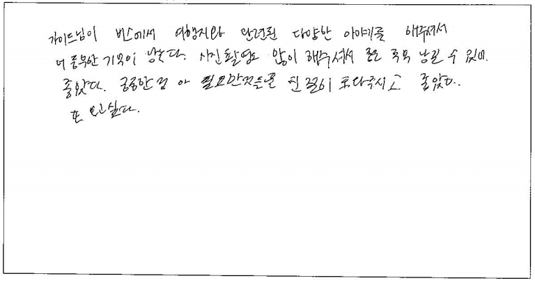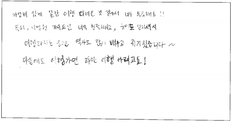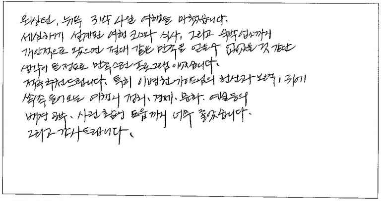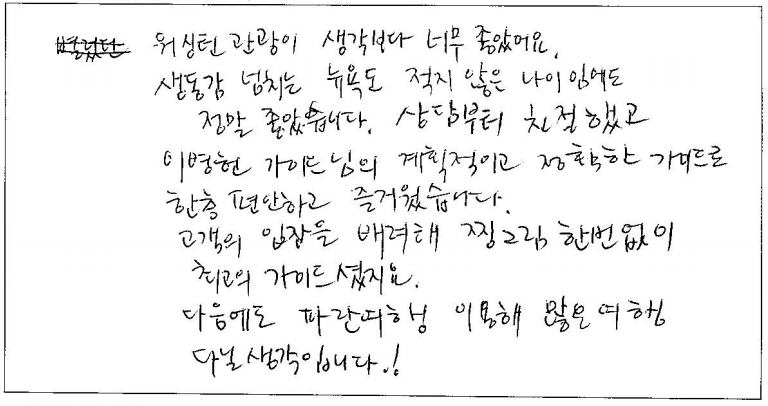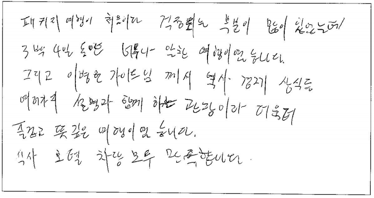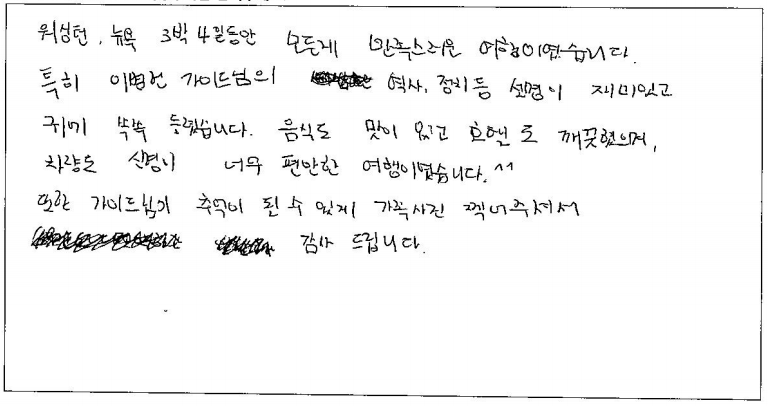 ![]() 처음 계획은 뉴욕만 3박4일 상품으로 다녀오려 했는데 워싱턴(벚꽃구경)까지 무리가 되지 않을까 걱정된 마음으로 출발하였습니다. 결론적으로 이렇게 다녀오길 정말 잘 했다는 생각입니다. 여행 초바자인 저에게는 절대로 혼자서는 다녀올 수 없을 1분도 헛트로 쓰지 않는 스케쥴과 구성이었습니다. 식사, 호텔, 버스 모두 맛있고 깨끗하고 최고의 만족이었습니다. 특히, 가이드님이 설명과 안내가 친절하시고 꼼꼼하고 세심하게 여행하는 내내 마음이 편안하게 해 주셔서 너무 감사했습니다. (화장실 안내까지...) 저처럼 이런 패키지 여행이 처음이시라면 파란여행 패키지(워싱턴+뉴욕) 추천드립니다. ![]() 패키지 여행이 처음이라 걱정되는 부분이많이 있었는데 3박4일동안 너무나 알찬 여행이었습니다. 그리고 가이드님께서 역사 경제 상식등 여러가지 설명과 함께 하는 관광이라 더욱 더 즐겁고 뜻깊은 여행이었습니다. 식사 호텔 차량 모두 만족합니다. ![]() 가이드님이 버스에서 여행지와 관련된 다양한 이야기를 해주셔서 더 풍부한 기억이 남는다. 사진촬영도 많이 해주셔서 좋은 추어 남길 수 있어 좋았다 궁금한점 또는 필요할 것들을 친절히 도와주시고 좋았다 또 오고 싶다. ![]() 파란여행을 통해 워싱턴 뉴욕 여행왔는데 정말 편하고 재미있었습니다. 첫날 버스로 이동하는 것 부터 넓은 좌석과 중식과 석식이 맛있었고 여행과정에서도 꼭 봐야하는 것들을 정리해 주셔서 동선도 효율적이었습니다. 정말 많은 것들을 볼 수 있었습니다. 그리고 자유시간에 가고 싶은 곳을 가이드님께 추려서 드리면 동선도 구성해 주셔서 감사했습니다! ![]() 워싱턴 관광이 생각보다 너무 좋았어요 생동감 넘치는 뉴욕도 적지않은 나이임에도 정말 좋았습니다. 상담부터 친절했고 가이드님의 계획적이고 정확한 가이드로 한층 편안하고 즐거웠습니다. 고객의 입장을 배려해 찡그림 한 번 없이 최고의 가이드셨지요. 다음에도 파란여행 이용해 많은 여행 다닐 생각입니다! ![]() 워싱턴+뉴욕 3박4일 여행!! 첫날은 미국가는 시간이 길어 지루하고 힘들 수 있는데 가이드님의 자세한 이야기들로 (정치, 경제, 문화, 종교, 예술)시간 가는줄 모르고 금방 미국에 도착할 수 있었습니다. 그냥 지나칠 수 있는 것들도 가이드님의 자세한 설명 덕분에 새롭게 알게되어 재미있는 시간이었습니다. 매 투어마다 알차고 신속하게 보낼 수 있어서 이번 가족여행을 잊지 못할 것 같습니다. 듣던대로 쇼핑강요하지 않고 고객우선으로 여행스케쥴이 움직여져서 너무나 좋은 시간이었습니다. 다음 여행 계획도 파란여행 가이드님과 함께하고 싶습니다. ![]() 워싱턴, 뉴욕 3박4일 여행을 마쳤습니다. 세심하게 설계된 여행 코스와 식사, 긜고 숙박업소까지 개인적으로 왔으면 절대 같은 만족을 얻을 수 없었을 것 같단 생각이 들 정도로 만족스런 프로그램이었습니다. 적극추천드립니다. 특히, 가이드님의 헌신과 노력, 귀에 쏙쏙 들어오는 여행지의 정치, 경제, 문화, 예술 등의 배경 공부, 사진 촬영 도움까지 너무 좋았습니다. 그리고 감사합니다. ![]() 결혼 40주년을 맞이하여 어디로 여행을 할까 망설였는데 주변에 미동부쪽을 여행을 소개 받았습니다. 여행사는 파란여행이 좋다고 해서 결정했고 차만타면 잠자는 제가 처음으로 가이드 선생님 말씀에 이번 여행이 너무 즐겁고 지루하지 않아서 너무 좋았습니다. 많은 여행을 다녔지만 최고였어요 파란여행 화이팅! ![]() 3박4일의 여정으로 세계의 정치 경제 중심지인 워싱턴, 뉴욕 잘 다녀왔습니다. 국경을 넘는 장거리 여행 안전운전해주신 기사님께 감사드립니다. 여행 내용을 알차게 리드해 주신 가이드님께는 더욱 고개숙여 감사드립니다. 부드러운 목소리와 아빠 미소와 안정감 주는 멘트로 여행자의 감정을 안정시켜주셨고 무엇보다도 해박한 지식으로 역사, 정치, 과학 등 여러방면으로 많은 지식을 전해 주셔서 많은 것을 배웠습니다. 즐겁게 일하시는 모습에 우리도 더불어 즐거웠습니다. 식사와 숙소도 좋았습니다. ![]() 3박 4일 이라는 짧은 기간중에 뉴욕과 워싱턴이라는 큰 두 도시의 가장 핵심적인 장소를 가장 잘 볼 수 있게 일정을 짜서 대단히 만족스러운 여행이었습니다. 그리고 우리를 가이드한 관광 가이드님께 친절함과 박학다식에 놀라웠으며 대단히 만족스러웠습니다. ![]() 가성비 있게 알찬 여행 다녀온 것 같아서 너무 뿌듯해요! 특히, 가이드님 너무 친절하시고 유머도 넘치셔서 여행다니는 동안 역사도 많이 배우고 즐거웠습니다 다음에도 여행가면 '파란여행'하려고요! ![]() 워싱턴, 뉴욕 3박4일동안 모든게 만족스러운 여행이었습니다. 특히 가이드님의 역사 정치등 설명이 재미있고 귀에 쏙쏙 들렸습니다. 음식도 맛이 있고 호텔도 깨끗했으며 차량도 신형이라 너무 편안한 여행이었습니다. 또한, 가이드님이 추억이 될 수 있게 가족사진 찍어주셔서 감사드립니다. |