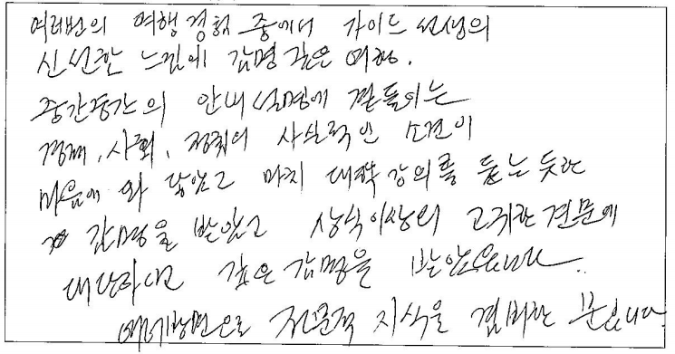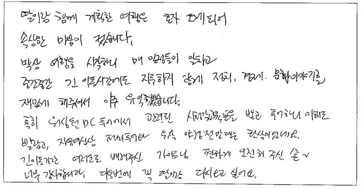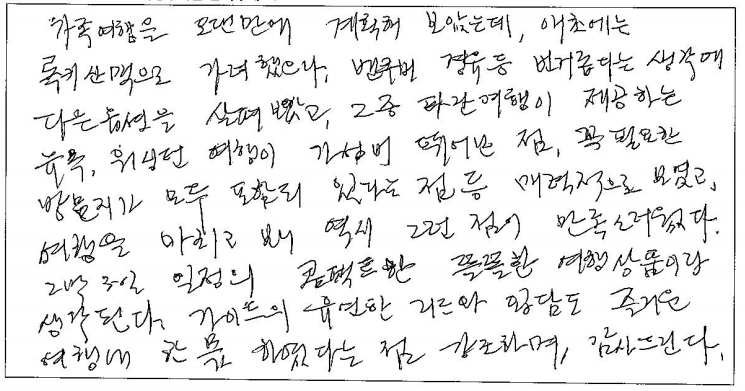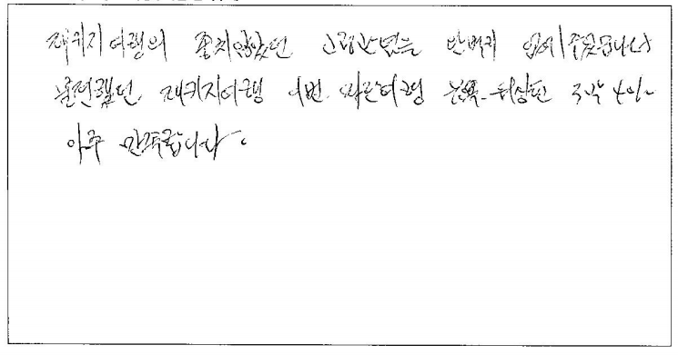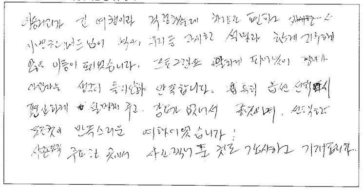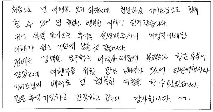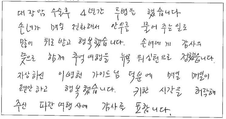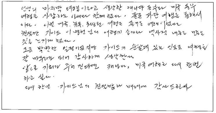 ![]() 미국 뉴욕 워싱턴 여행이 처음이라 어떻게 하면 후회없이 알차게 다녀올 수 있을지 막막했는데 파란여행 상품 덕분에 즐겁고 무사히 다녀올 수 있었어요! 워싱턴과 뉴욕에서 꼭 가야할 곳이나 해야될 것들도 잘 알려주셔서 알찬 여행이었어요. 특히, 가이드님 너무 친절하시고 미국에 대한 경험이나 배경지식이 많으셔서 가는 곳마다 중요한 역사나 재미있는 이야기 많이 해주셔서 더 재미있었어요. 사진도 잘 찍어주시고 잘 안내해주셔서 감사했습니다 :) 여행 중 가는 곳마다 너무 만족스럽고 오길 잘했다 생각했던 기획이었고 억지로 해야되거나 사야하는 것도 없어서 좋았어요! 다음에 여행하거나 여행사 추천할 때 무조건 파란여행 추천할 것 같아요. 마지막으로 버스기사님 친절하시고 안전하게 운전해주셔서 감사했습니다. 다음에 또 올게요~ ![]() 이동거리가 긴 여행이라 걱정했는데 차량도 편하고 가이드님이 역사, 지리등 자세하고 설명과 함께하여 지루하지 않은 이동이 되었습니다. 프로그램도 알차게 되어있어 경비가 아깝다는 생각이 들지 않아 만족합니다. 특히, 옵션 선택시 편안하게 설명해주고 강요가 없어서 좋았으며 선택한 모든 것이 만족스러운 여행이었습니다! 주요한 곳에서 사진 찍어 준것도 감사하고 기대됩니다. ![]() 패키지 상품은 다 같은 것이라고 생각했습니다. 그러기에 값이 싸면 싼 만큼 비싸면 비싼만큼 대우를 받는다고 생각했습니다. 이번 파란여행 뉴욕+워싱턴 3박4일을 통해 패키지에 대한 편견을 버렸습니다. 전체적인 상품 구성이 좋았고 무엇보다도 쇼핑의 강요도 없어 여행에 전념할 수 있었습니다. 훌륭한 상품을 기획해 주신 파란여행에 감사드립니다. 많은 분들이 이용하셨으면 합니다. 그리고 여행을 더욱 즐겁고 풍요롭게 해주신 가이드님께도 감사드립니다. 미국 역사와 유럽의 역사, 문화에 통달하신 것을 떠나 짧은 시간에 핵심을 전달해주시는 능력이 탁월하십니다. 방송에 출연하셔서 강의 하시는 교수님보다 더 뛰어나십니다. 감사합니다. ![]() 가족여행을 오랜만에 계획해 보았는데, 애초에는 록키산맥으로 가려했으나 벤쿠버 경유 등 번거롭다는 생각에 다른 옵션을 살펴보았고 그 중 파란여행이 제공하는 뉴욕, 워싱턴 여행이 가성비 뛰어난 점 꼭 필요한 방문지가 모두 포함되 있다는 점 등 매력적으로 보였고 여행을 마치고 보니 역시 그런 점이 만족스러웠다. 2박3일 일정의 콤팩트한 여행상품이라 생각된다. 가이드의 유연한 리드와 입담도 즐거운 여행에 한 몫 하였다는 점 강조하며, 감사드린다. ![]() 인생의 마지막 여행이라고 생각한 캐나다 동부와 미국 동부 여행을 사랑하는 아내와 함께했다. 물론, 파란여행을 통해서이다. 이번 미국, 뉴욕, 워싱턴 여행은 즐거운 여행이었다. 친절한 가이드님의 여행지 소개와 역사적 내용 모든 것을 느끼게 했다. 조금 빡빡한 일정이었지만 가이드의 순발력있는 인도로 여행을 잘 마무리가 되어 감사하게 생각한다. 앞으로 기회가 주어진다면 캐나다, 미국여행은 다시 한 번 하고 싶다. 다시 한 번 가이드님의 친절함과 배려에 감사드린다. ![]() 오랜만에 여행을 하게 되었는데, 파란여행을 통하여 미국(뉴욕, 워싱턴)을 매우 만족하며 여행할 수 있었습니다. 가이드님의 친절하신 설명으로 여행지를 보다 더 잘 보고 느낄 수가 있었습니다. 가이드님의 미국 역사 설명, 경제, 금융 등의 배경설명을 통하여 미국을 좀 더 자세히 알게되었습니다. 맨한탄에서 좀 더 긴 자유시간을 보여, 맨하탄을 자세히 볼 수 있었습니다. 파란여행의 여행은 저 에게 의미있고 가치있는 여행을 주어 감사했습니다. Thank you. ![]() 대장암 수술 후 4년간 투병을 했습니다. 손녀가 매일 전화해서 안부를 물어 주는 일로 많이 위로 받고 행복했습니다. 손녀에게 감사의 뜻으로 함께 추억여행을 뉴욕 워싱턴으로 정했습니다. 자상하신 가이드님 덕분에 매일 매일이 편안하고 행복했습니다. 귀한 시간을 허락해 주신 파란여행에 감사를 표합니다. ![]() 뉴욕, 워싱턴 3박4일 여행. 짧다면 짧지만 내용면에선 정말 알찬 여행이었어요. 특히 가이드분의 해박한 지식과 재미있는 설명에 차안에서도 전혀 지루하지 않았어요 여행 구성면에서도 더할 나위 없이 알차고 진행이 매그러워서 시간 아까운 낭비 없이 여러가지로 골고루 즐길 수 있어서 정말 좋았어요 또한 쓸데없는 쇼핑이나 강매가 전혀 없어서 마음이 편했구요. 3박 4일이 다 지나니 아쉬워서 더 같이 여행을 계속하고 싶은 마음입니다. 다음 여행도 파란과 가이드님과 함께 하고 싶습니다. ![]() 이번 여행을 통해서 미국이란 나라를 새롭게 알았습니다. 특히, 뉴욕은 손에 꼽힐 정도로 아름다웠습니다. 친절한 가이드님 덕에 더욱 즐거웠습니다. ![]() 처음으로 먼 여행을 오게되었는데 친절하신 가이드님으로 함께 할 수 있어 너무 즐겁고 행복한 여행이 된 것 같습니다. 귀에 쏙쏙 들어오는 후기를 설명해주시니 여행지에 대한 이해가 쉽고 기억에 남을 것 같습니다. 전에는 강매를 요구하는 여행사 때문에 불편하고 힘든 부분이 많았는데 여행지를 위한 많은 배려가 있어 파란여행과 가이드님의