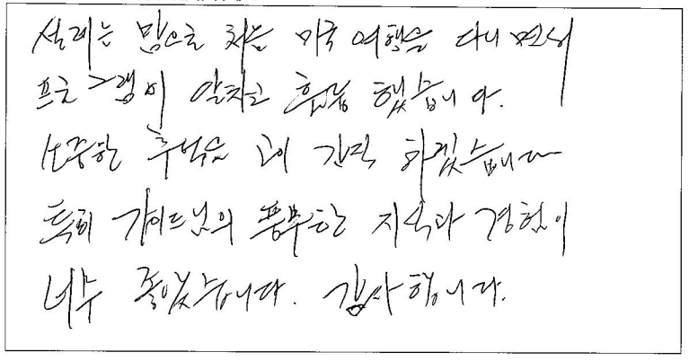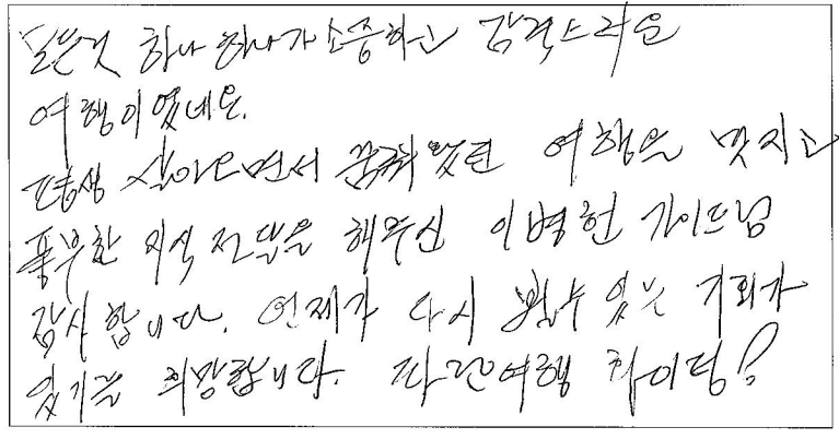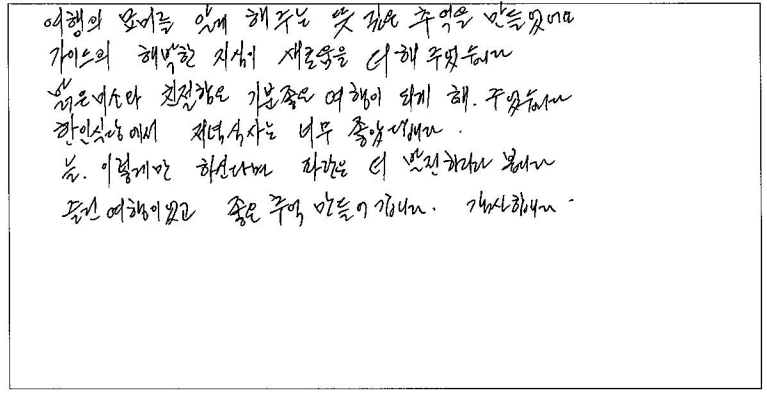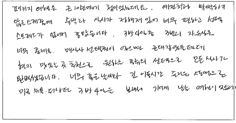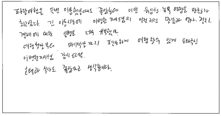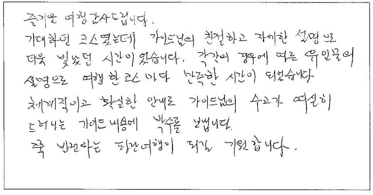 ![]() 이번 뉴욕+워싱턴 여행을 다녀왔습니다. 3박 4일 동안 정말 알차고 즐겁게 다녀왔습니다 ㅎㅎ 미국여행은 처음이라 불안했지만 여행 전부터 파란여행 상담문의 통해 쉽고 정말 안전하게 잘 준비할 수 있었습니다. 긴 이동거리가 있었지만 가이드님을 만나서 알차고 재밌게 그 시간도 보낼 수 있었습니다. 원래라면 지루했을 역사 이야기도 전혀 지루하지 않고, 오히려 여행의 기대를 더 높여주었고 정말 친절하시고 많은 관심 가져주셔서 여행의 처음과 끝이 즐거웠습니다. 여행 일정과, 호텔, 현지 식당은 정말 최고였고 기사님도 너무 친절하시고 운전을 잘 하셔서 걱정 하나 없이 여행을 마쳤네요. 패키지 여행이라 쇼핑 같은 부분도 살짝 걱정했는데 파란여행은 쇼핑 강요가 전혀 없어서 놀랄 정도로 좋았어요! 이번 여행 무사히 정말 행복하게 보낼 수 있게 만들어준 파란여행! 정말 감사드리고 가이드님과 운전 기사님께 정말 감사드립니다! 수고 많으셨습니다 :) ![]() 모든 것 하나하나가 소중하고 감격스러운 여행이었네요. 평생 살아오면서 꿈꿔왔던 여행을 멋지고 풍부한 지식 전달을 해주신 가이드님 감사합니다. 언제가 다시 뵐 수 있는 기회가 있기를 희망합니다. 파란여행 화이팅! ![]() 파란여행을 두번 이용했을때도 좋았는데 이번 워싱턴, 뉴욕여행은 만족도가 최고였다. 긴 이동시간에 가이드님의 이런저런 말씀과 역사, 정치, 결제에 대한 설명은 더욱 유익했다. 여행 첫날 부터 마지막날까지 편안하게 여행할 수 있게 도와주신 가이드님 감사드려요. 호텔과 식사도 좋았다고 생각합니다. ![]() 패키지 여행은 근 10년만에 청이었는데요. 예전처럼 빡빡하지 않은 스케쥴에 숙박과 식사가 정해져 있어 너무 편하고 선택 스트레스가 없어서 좋았습니다. 3박4일 중 3번의 자유식은 너무 좋네요. 매 식사 선택권이 없으면 군대같았을텐데 현지 맛있는 곳 추천으로 원하는 종류의 선택으로 모든 식사가 완벽했습니다. 너무 좋은 날씨와 긴 이동시간 즐거운 설명으로 미국 뉴욕, 워싱턴 3박4일을 보내서 기억에 남는 여행이었습니다. ![]() 3박4일 워싱턴+뉴욕 관광을 가이드님과 함께 했습니다. 여행 내내 너무 즐겁게 안내해주시고, 관련된 배경과 역사적 지식까지 자세히 설명해주셔서 도움이 되었고 감사합니다. 가이드님 덕분에 즐거운 여행할 수 있었습니다. 또한, 친절하게 신경써서 찍어주신 사진까지 너무 감사합니다. 여행 프로그램도 알차게 잘 구성되어 있어서 좋았습니다. 즐겁고 만족스러운 여행이었습니다. ![]() 즐거운 여행감사드립니다. 기대하던 코스였는데 가이드님의 친절하고 자세한 설명으로 더욱 빛났던 시간이었습니다. 각각의 경우에 따른 유인물의 설명으로 여행한 코스 마다 만족한 시간이 되었습니다. 체계적이고 확실한 안내로 가이드님의 수고가 확실히 드러나는 가이드 내용에 박수를 보냅니다. 쭉 발전하는 파란여행이 되길 기원합니다. ![]() 이번 뉴욕, 워싱턴 여행은 생각했던 것보다 알찬 여행을 보낸것 같다. 첫째 잘 짜여진 스케쥴로 낭비된 시간없이 꼼꼼한 설계로 잘 다녀보고 즐거운 시간이었다. 둘째 노옵션으로 편안한 여행이었고 셋째 가이드 설명도 유용하고 다양한 전달로 여행의 즐거움을 더했다 (가이드가 정해준 시간도 적당해서 좋았다) 넷째 종합적으로 너무 즐겁고 보람있는 시간을 보낸 것 같다. ![]() 캐나다에 사는 동생의 소개로 파란여행을 알게 되었어요 여행에서 가장 중요한 건 프로그램(여행 일정의 알참)과 베테랑 가이드가 함께 해야 된다는 것을 항상 느낍니다. 이번 여행에서 가이드님의 알차고 편안한 진행과 질문에 나이스한 대답들이 기억에 많이 남습니다. 뉴욕&워싱턴에 많은 기대를 하고 왔는데, 좋으신 가이드님과 함께해 행복한 여행으로 기억될 듯 합니다. 다음 여행 오시는 분들에게도 저희 여행때 처럼 편안, 따뜻, 여유, 알참으로 진행 부탁드려요 좋은 인연으로 기억하겠습니다! 미국 안녕~ ![]() 이번 뉴욕&워싱턴 여행. 가이드님과 함께 해서 너무 즐거웠습니다. 뉴욕에 며칠 더 있고 싶은 마음에 더 커지고 또 여행을 오고 싶다고 생각을 했습니다. 앞으로도 좋은 여행 많이 부탁드립니다. 다음에 또 오게되면 파란여행을 통해 올 것 같습니다. 좋은 추억 만들어주셔서 감사합니다 See you again! USA ![]() 처음 미국을 방문하게 되어 여행전에는 여러가지 궁금한 점과 살짝 걱정되는 부분도 있었는데 가이드님께서 사전에 충분한 설명해주시고 매일 참고자료를 만들어주셔서 초행길이지만 즐거운 여행이 되었습니다. 특히, 복잡한 뉴욕에서 점심때 저녁 때 각각 뉴욕에 사는 지인을 만날 계획이 있었는데 가이드께서 말씀해주신 시간과 오차가 거의 없어 예정된 만남을 잘 할 수 있었습니다. 여행 스케쥴의 진행을 그만큼 빈틈없이, 차지없이 했다는 것을 느꼈습니다. 캐나다에 살고있는 여동생의 추천으로, 캐나다 방문 중에 미국여행을 하게 되었는데 하루 쉬고 또 캐나다 국내여행도 파란여행으로 갈 예정입니다! ![]() 전에 미국에는 출장 차 온 경험분이었는데 이번에 파란여행에서 하는 프로그램에 참여해서 미국을 둘러보니 가이드의 설명과 