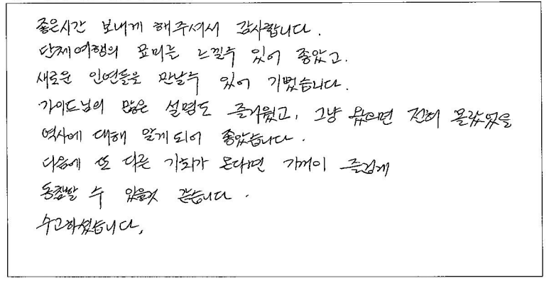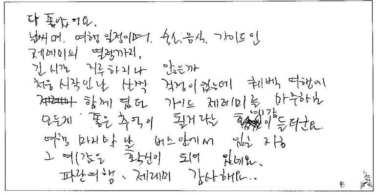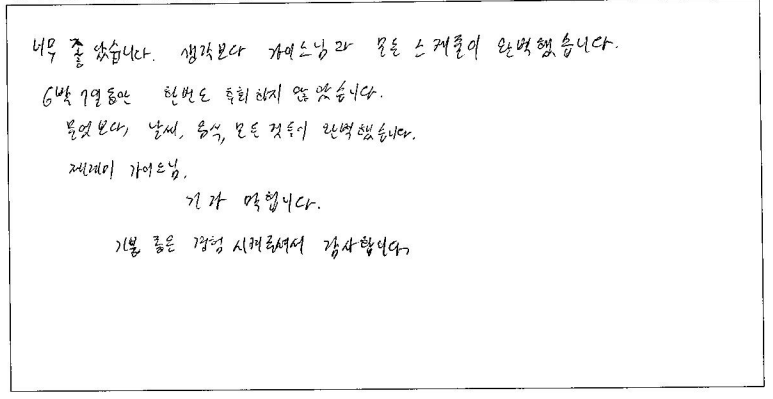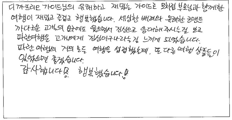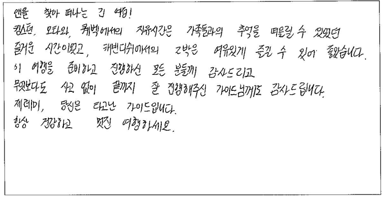 ![]() 혼자 여행코스를 짜고 숙소 및 이동수단까지 마련하기가 어려워 6박7일 PEI를 투어를 신청하여 다녀왔는데 탁월한 선택이었습니다. 숙소, 식사, 코스 모두 만족스러웠고 특히 가이드님이 혼자 왔다고 너무 많이 챙겨주셔서 정말 감사했습니다. 덕분에 인생샷도 얻고 안전하고 즐겁게 다녀왔습니다. 다음에 기회가 된다면 또 한 번 가고 싶습니다. 너무너무 행복했습니다! ![]() 다 좋았어요. 날씨며, 여행일정이며 숙소, 음식, 가이드인 제레미 열정까지 긴시간 지루하지가 않을까 처음 시작인 날 살짝 걱정이었는데 퀘벡여행에 함께 였던 가이드님을 만나고 모든게 좋은 추억이 될거라는 예감이 들더군요 여행 마지막날 버스안에서 있는 지금 그 예감은 확신이 되어 있네요. 파란여행 가이드님 감사해요 ![]() 좋은 시간 보내게 해주셔서 감사합니다. 단체여행의 묘미를 느낄 수 있어 좋았고 새로운 인연들을 만날 수 있어 기뻤습니다. 가이드님의 많은 설명도 즐거웠고, 그냥 왔으면 전혀 몰랐었을 역사에 대해 알게 되어 좋았습니다. 다음에 또 다른 기회가 된다면 기꺼이 즐겁게 동참할 수 있을 것 같습니다. 수고하셨습니다. ![]() 디카프리오 가이드님의 유쾌하고 재밌는 가이드로 모처럼 부모님과 함께한 여행이 재밌고 즐겁고 행복했습니다. 세심한 배려와 유쾌한 코멘트 까다로운 고객의 요구에도 웃으면서 진심으로 응대해 주시는걸 보고 파란여행은 고객에게 진심이구나라는걸 느끼게 되었습니다. 파란여행의 거의 모든 여행을 섭렵했는데 또 다른 여행상품들이 있었으면 좋겠습니다. 감사합니다! 행복했습니다! ![]() 앤을 찾아 떠나는 긴 여정! 킹스턴, 오타와, 퀘벡에서의 자유시간은 가족들과의 추억을 떠올릴 수 있었던 즐거운 시간이었고, 캐빈디쉬에서 2박은 여유있게 즐길 수 있어 좋았습니다. 이 여행을 준비하고 진행하신 모든 분들께 감사드리고 무엇보다도 사고 없이 끝까지 잘 진행해주신 가이드님께도 감사드립니다. 가이드님, 당신은 타고난 가이드입니다. 항상 건강하고 멋진 여행하세요. ![]() 너무 좋았습니다. 생각보다 가이드님과 모든 스케쥴이 완벽했습니다. 6박 7일동안 한 번도 후회하지 않았습니다. 무엇보다 날씨, 음식, 모든 것들이 완벽했습니다. 가이든미 기가 막힙니다. 기분 좋은 경험 시켜주셔서 감사합니다. ![]() 오랫만에 일탈하여 여행을 하니 너무 행복하였습니다. 박식하신 가이드님 덕분에 가는 곳마다 캐나다 역사에 담긴 인물들의 업적을 알게 되었던 드넓은 초원에 병풍 같이 편해지는 자연. 1년치 웃음을 가불하여 다 웃고 온 여행이었다. 올드퀘벡 PEI 할리팩스 가는 곳마다 눈이 부시게 아름다운 경험은 가슴 한 켠에 차곡차곡 담아왔다. 마음이 힘들 때 하나씩 꺼내어 추억여행을 할 것이다. 빨강머리 앤이 되어 찍은 사진은 두고두고 나에게 웃음을 선사할 것이다. 가이드님의 중독성있는 말투(맛있어, 커밍순) 두 단어는 영원히 마음에 남아 있을 것 같다. 하하 호호 내 생애 이번 여행은 최고의 여행이었다. 여행중에 만난 모든 인연들 감사합니다. 모두 모두 사랑합니다. |