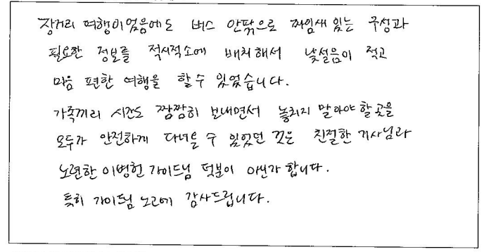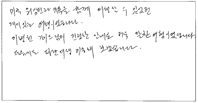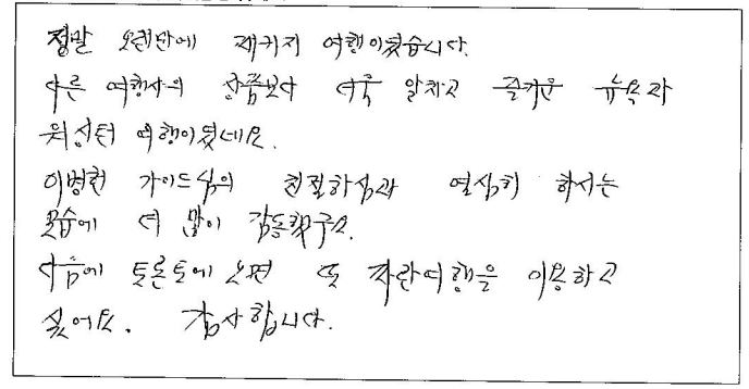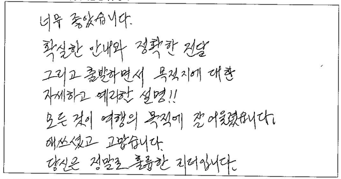 ![]() 뉴욕과 워싱턴에서 유명하고 인기있는 곳은 거의 다 갔기 때문에 재미있었다. 특히, 이번에 여행하면서 먹은 음식들도 다 맛있었고 호텔들도 다 너무 좋았다. 사진으로만 봤던 곳들을 모두 실제로 보고 사진도 찍을 수 있어서 너무 신기했고 재밌는 여행이었다. ![]() 정말 오랫만에 패키지 여행이었습니다. 다른 여행사의 상품보다 더욱 알차고 즐거운 뉴욕과 워싱턴 여행이었네요. 가이드님의 친절하심과 열심히 하시는 모습에 더 많이 감동했구요 다음에 토론토에 오면 또 파란여행을 이용하고 싶어요. 감사합니다. ![]() 처음 가는 미국여행 알차게 4일동안 둘러보고 즐길 수 있어 좋았습니다. 짧은 시간동안 최대한 많은 곳에 방문할 수 있어 좋았습니다. 다음에도 또 이용하고 싶습니다 ![]() 장거리 여행이었음에도 버스 안팎으로 짜임새 있는 구성과 필요한 정보를 적시적소에 배치해서 낯설음이 적고 마음 편한 여행을 할 수 있었습니다. 가족끼리 시간도 짬짬히 보내면서 놓치지 말아야할 곳을 모두가 안전하게 다녀올 수 있었던 것은 친절한 기사님과 노련한 가이드님 덕분이 아닌가 합니다. 특히, 가이드님 노고에 감사드립니다. ![]() 뉴욕, 워싱턴 3박4일 여행후기. 여행 기간동안 여러 일정을 차질 없이 소화해 낼 수 있게 베테랑 가이드님이 잘 이글어 주셨습니다. 여행지에 온전히 집중되고 꼼꼼한 설명과 가이드로 편안했어요 크고 작은 트러블이 생기지 않도록 안전을 최우선으로 하시는 모습이 인상적이었습니다. 여행을 마무리하느 시간이 아쉽기도 하고 또 다시 여행을 하게 된다면 '파란여행'을 다시 찾겠습니다. 고맙습니다. ![]() 3박 4일 워싱턴, 뉴욕여행을 무사히 마치고 귀가길에 후기를 쓰면서 계획대로 뿌듯하게 끝마침에 감사한다. 가이드님의 통솔력에 감탄하며, 뉴욕에서 벌어진 각종행사에도 스케쥴에 차질없이 대처하여, 이 여행단체를 이끄는 순발력에 또 한 번 감탄했다. 친절이 몸에 베인듯한 음성으로 모두를 편안하게 해주심에 감사한다. 워싱턴은 내 생각보다 멋졌고, 뉴욕은 멋지지만 소란스러운 느낌이다. 가이드님이 막학다식하고 귀에 쏙쏙들어오게 다방면에 설명을 잘 해주셔서 감사하다. ![]() 처음 방문한 미동부 기대한 만큼 만족도가 높았습니다. 가이드님 설명이 너무 좋았습니다. 정치, 경제, 미술 여러가지 다양하게 설명을 해주시고 즐거운 여행을 마쳤습니다. 수고 많이 하셨습니다. ![]() 미동부 여행 코스 좋았습니다. 숙소, 식사, 가이드 굿 특히, 가이드님의 박식한 지식이 풍부한 경험에 감사드립니다. 또 기회되면 함께 하겠습니다. ![]() 너무 좋았습니다. 확실한 안내와 정확한 전달 그리고 출발하면서 목적지에 대한 자세하고 예리한 설명! 모든 것이 여행의 목적에 잘 어울렸습니다 애쓰셨고 고맙습니다. 당신은 정말로 훌륭한 리더입니다. ![]() 3박4일 일정의 미국동부 여행은 여러가지 점에서 유익한 여행이었다. 평소 미국에 대한 호불호의 생각이 있었지만 한 번은 꼭 와봐야 하는 여행지었다. 기대만큼이나 파란여행의 기획, 일정등이 너무나 마음에 들었다. 가이드님의 자세한 설명이나 사전지식 전달사항등에서 많은 노력과 준비성에서 좋은 인상을 받았다. 그 동안 몇번의 해외여행 중 이번 여행이 가장 보람있는 여행이 아니었나 생각한다. 특히, 쓸데없는 쇼핑 등이 없는 잘 준비된 일정 덕분에 좋은 추억을 갖고 마칩니다. ![]() 미국 워싱턴과 뉴욕을 함께 여행할 수 있었던 재미있는 여행이었습니다. 가이드님의 친절한 안내로 더욱 알찬 여행이었습니다. 다음에도 파란여행 이용해보겠습니다. ![]() 유학원을 통해 알게되었고 저번 여행으로 퀘벡을 갔었습니다. 그 때 여행도 너무 재밌어서 이번 워싱턴과 뉴욕을 신청하였고 이번 여행 역시 너무나도 재미있었습니다. 다음에도 기회가 된다면 또 이용하고 싶습니다. ![]() 워싱턴은 이번이 처음이었고 뉴욕은 두 번째 여행이었는데 우선 가이드님의 친절하고 자세한 설명 그리고 시간을 낭비하지 않기 위해 매우 열심히 인솔해 주시는 모습이 너무 감사했다. |