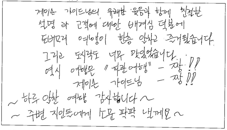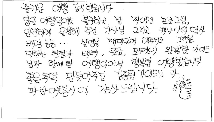 ![]() 오늘 파란여행을 통해 '토버모리'를 다녀왔습니다. 배를 타고 등대 난파선을 보았고 꽃병섬에 도착해서 맑은 물에 발을 담그며 주변의 아름다운 경치를 바라보면서 힐링되는 여행을 했습니다. (여유로운 힐링 시간을 하게 해주신 파란여행에 감사드립니다) 무엇보다도 가이드님의 토버모리에 대한 역사 설명, 지도 덕분에 더 알찬 여행이었습니다. 그리고, 가이드님이 말씀해주신 여행의 의미에 대해서 다시 한 번 생각하면서 가을 단풍 여행도 파란여행과 함께 가려고 합니다. (가이드님의 유쾌함과 웃음 덕분에 좋은 여행했습니다 감사합니다) ![]() 유쾌한 가이드님 덕분에 즐거운 하루를 시작했습니다. 이른 아침이라 잠이 덜 깬 상태였는데 유쾌한 목소리와 친절한 안내로 시작하는 하루 소풍 (토버모리)은 날씨와 가이드님과 편안한 차량과 한식 도시락으로 만족한 하루였습니다. 감사합니다. ![]() 즐거운 여행 감사했습니다. 당일 여행임에도 불구하고 잘 짜여진 프로그램, 안전하게 운전해 주신 기사님. 그리고 캐나다의 역사 배경 등등... 설명을 재미있게 해주시고 고객을 대하는 친절과 배려, 웃음, 모든 것이 완벽한 가이드님과 함께한 여행이어서 행복한 여행했습니다. 좋은 추억 만들어주신 가이드님과 파란여행에 감사드립니다. ![]() 우리의 행복한 바이러스 가이드님께 잘 배웠어요 아침 일찍 가야되서 힘들었는데 가이드님이 귀에 쏙쏙 들어오게 해주셔서 잠이 깨고 지식을 더 알게되었어요 다음 코스인 킹스턴, 뉴욕도 알차게 해보아요. ![]() 가이드님의 유쾌한 웃음과 함께 친절한 설명과 고객에 대한 배려심 덕분에 토버모리 여행이 한층 알차고 즐거웠습니다. 그리고 도시락도 너무 맛있었습니다. 역시 여행은 '파란여행' 짱! 가이드님 짱! 하루 알찬 여행 감사합니다~ 주변 지인들에게 소문 팍팍 낼게요~ |
