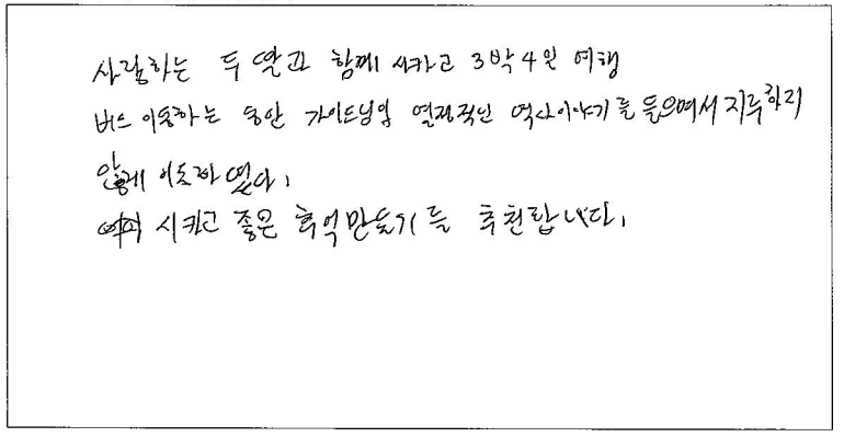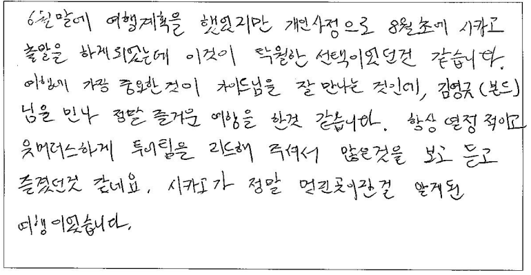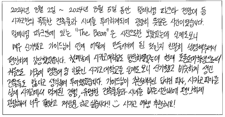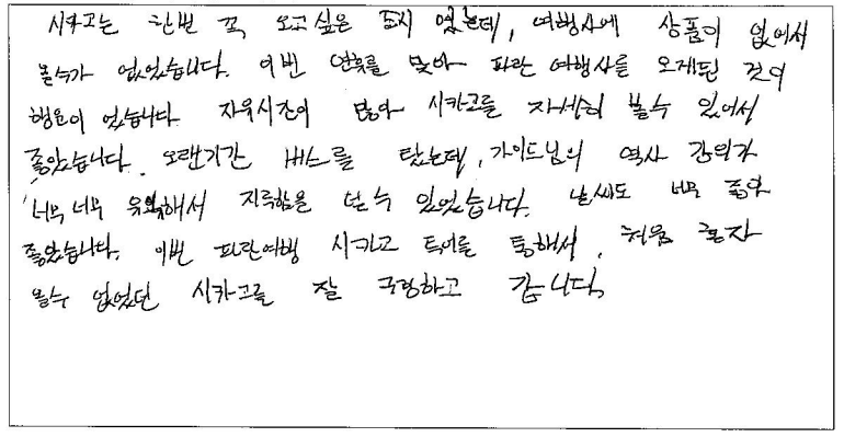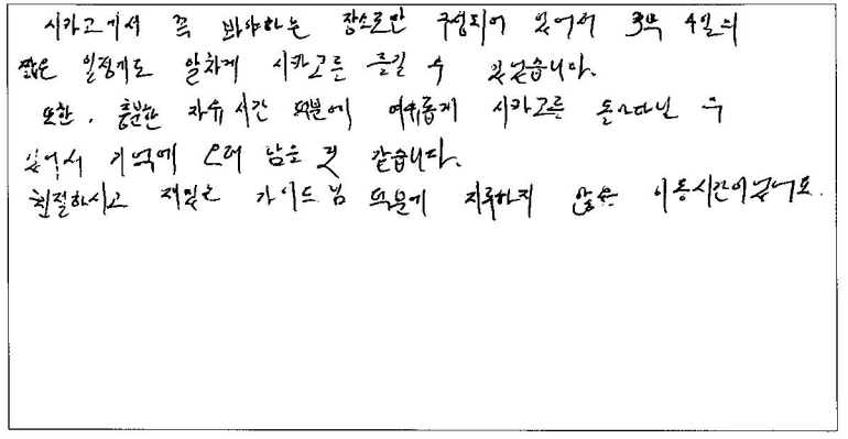 제목 | 2024년 08월 02일 출발 시카고만4일 자필후기 | ||