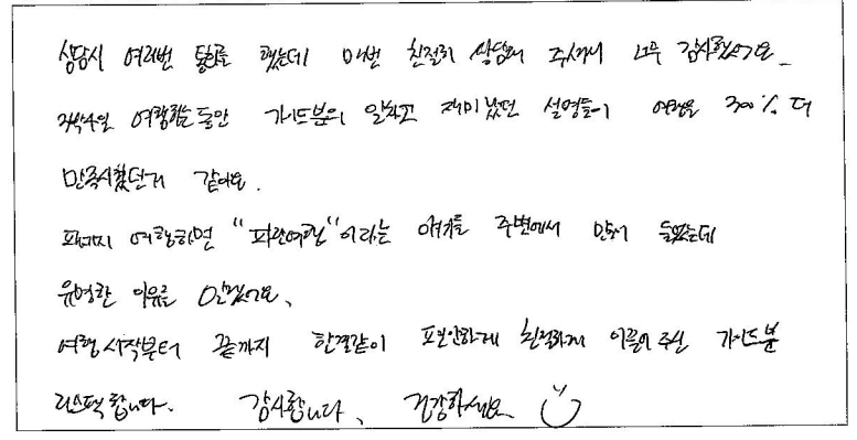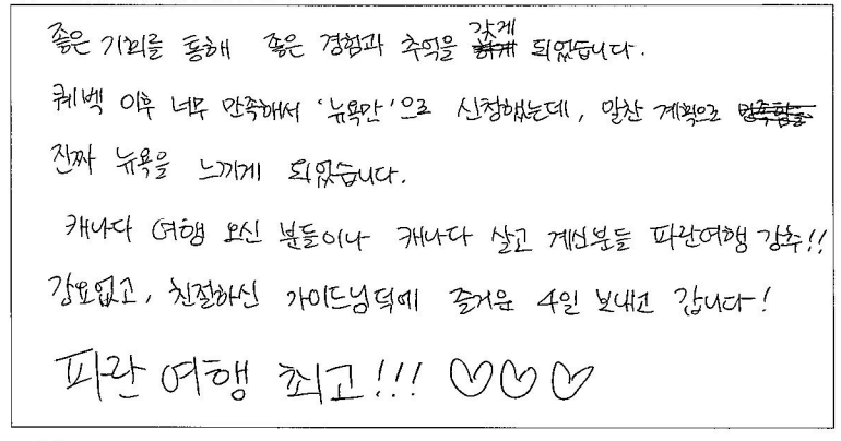 ![]() 최대한 효율적인 스케쥴로 정말 많은 곳을 둘러볼 수 있었습니다. 호텔 및 식사는 모두 훌륭하고 가이드께서 준비한 여행자료들도 공중화장실 위치 등 타 자료에서 얻기 힘든 정보였습니다. 호텔, 식사, 가이드의 훌륭함을 믿고 선택해도 좋을 것 같네요. ![]() 뉴욕을 처음 방문했는데 기대이상으로 좋았습니다! 여행 일정이 잘 짜여 있어서 뉴욕의 명소를 골고루 방문할 수 있었습니다. 가이드님도 너무 재미있고 친절했습니다. 파란여행 최고! ![]() 짧은 시간 동안 뉴욕의 필수 명소를 다 둘러볼 수 있어서 좋았어요. 다시 오고 싶어요! 호텔도 너무 좋고 차량도 너무 좋았습니다. 파란여행 최고 다음에 꼭 이용할게요! ![]() 퀘벡때보다 버스가 편해서 좋았습니다 가이드님이 너무너무 친절했어요! 시간대비 가성비가 너무 좋았어요 ![]() 뉴욕 3박4일 일정이 알차게 느껴질만큼 좋은 기억이 많았습니다. 처음 패키지 여행이라 불안하기도 하였지만 친절하고 박학다식한 가이드님과 좋은 분들과의 만남이 너무 행복한 추억이었습니다. 다음에 어디를 가야할지 고민이 될만큼 또 신청하고픈 마음입니다. 처음부터 끝가지 잘 챙겨주시고 리드해주신 가이드님 너무너무 고맙습니다. 항상 건강하시고 조만간 또 다른 여행으로 만나요! ![]() 늘 오고 싶었던 뉴욕을 첫 졸업여행으로 와서 너무 좋았습니다. 부모님 없이 친구랑 둘이 가서 걱정도 됐었고 혹시나 길을 잃어버릴까 잠을 못자진 않을까 했던 제가 바보같네요. 7시간 가는 동안 미국 역사도 알려주시고 재밌는 이야기도 많이 해주셔서 전혀 지루하지 않았어요! 3박 4일 동안 너무 잘 챙겨주셔서 감사하고 뉴욕에 있는 명소들 다 볼 수 있어서 좋았습니다. 가이드님 덕분에 제 뉴욕 추억은 예쁜 그림으로 남겠네요! 파란여행 강추합니다 감사합니다 ![]() 좋은 기회를 통해 좋은 경험과 추억을 갖게 되었습니다. 퀘벡이후 너무 만족해서 뉴욕만4일로 신청했는데, 알찬 계획으로 진짜 뉴욕을 느끼게 되었습니다. 캐나다 여행 오신 분들이나 캐나다 살고 계신분들 파란여행 강추! 강요없고 친절하신 가이드님 덕에 즐거운 4일 보내고 갑니다! 파란여행 최고!!! ![]() 퀘벡여행에 이어 이번엔 뉴욕3박4일! 여행을 파란여행과 함께 해보았는데요 ㅎㅎ 궃은 날씨에도 불구하고 가이드님의 친절한 안내와 최적화된 일정으로 인해 행복한 여행을 했습니다. 저의 첫 미국여행을 행복한 기억으로 남게 해주셔서 감사해요. 사랑해요 파란여행 번창하세요 ![]() 상담시 여러번 통화를 했는데 매번 친절히 상담해 주셔서 너무 감사했어요 3박4일 여행하는 동안 가이드분의 알차고 재미났던 설명들이 여행을 30% 더 만족시켰던 거 같아요. 패키지 여행하면 '파란여행'이라는 얘기를 주변에서 많이 들었는데 유명한 이유를 알겠어요 여행시작부터 끝까지 한결같이 편안하게 친절하게 이끌어주신 가이드분 리스펙합니다. 감사합니다. 건강하세요 |