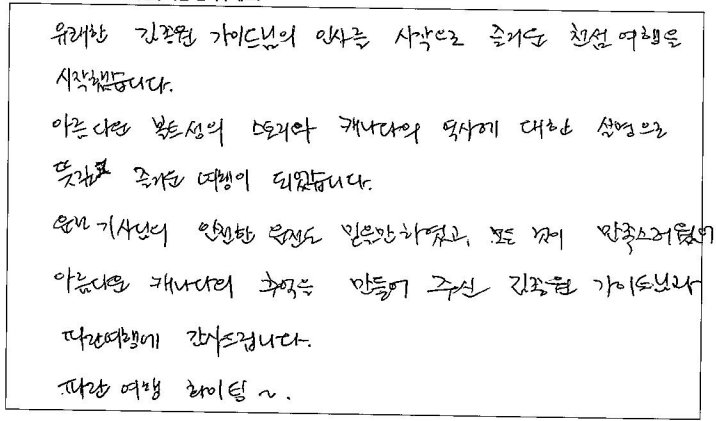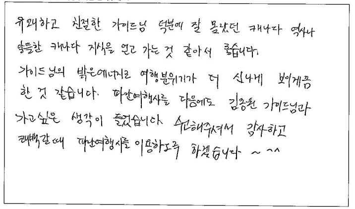 ![]() 친구의 추천으로 선택하게 되었는데요. 정말 잘 선택한 것 같습니다. 정말 행복한 여행이었습니다 가이드님의 웃음과 시원시원한 목소리가 여행을 한 층 더 신바람나게 해 주었습니다. 당일 여행으로 어딜갈까 고민 중 이시면... 망설이지 마세요. 파란여행 당일여행인 천섬+킹스턴으로 힐링하세요! 주변 친구들에게 꼭 추천할게요. ![]() 관광을 목적으로 캐나다에 오게된게 아니고 학교에서 단체로 짧게 하루 여행을 통해 교수님과 또는 친구, 동생들과 짧지만 추억을 만들고 싶었는데 적합했던 것 같습니다. 단체라서 신경쓰시는 것도 많고 제약이 많이 있었을텐데 상담도 해주시고 친절한 가이드님. 직원분들 모두 좋았습니다. 짧은 여행기간 중 하루 이틀 시간이 비어서 어쩔 줄 모르겠는데 하루를 유익하게 보내고 싶다면 파란여행 상품을 이용하는 것처럼 좋은 선택이 될 것 같습니다. ![]() 학교 해외연수를 통해 오게되었는데 가이드분이 친절하게 설명도 해주시고 차도 편해서 재미있게 보았어요. 휴게소도 멋지고 볼거리가 많아서 좋았습니다. 크루즈 타기전에 볼트성의 이야기를 들려주셔서 흥미있게 보았습니다. 다음에 학교 단체가 아니라 개인으로 오게되면 꼭 파란여행을 통해 투어하고 싶습니다. ![]() 가족과 함께 편안하게 여행다녀왔습니다. 가이드님도 친절하고 열정적이셔서 덕분에 너무 알차고 좋은 여행이 되었어요. 차량도 편안하고 여행 직원분들도 친절하셔서 매우 즐거웠습니다. 모두에게 추천드립니다! ![]() 유쾌하고 친절한 가이드님 덕분에 잘 몰랐던 캐나다 역사나 알뜰한 캐나다 지식을 얻고 가는 것 같아서 좋습니다. 가이드님의 밝은 에너지로 여행 분위기가 더 신나게 보이게 끔 한 것 같습니다. 파란여행을 다음에도 가이드님과 가고싶은 생각이 들었습니다. 수고해주셔서 감사하고 퀘벡갈때 파란여행을 이용하도록 하겠습니다. ![]() 혼자 캐나다 생활하며 꼭 가보고 싶었던 곳을 파란여행과 함께해서 너무 즐거웠습니다. 가이드님께서 전달해주시는 정보들을 통해 알지 못했던 많은 지식을 얻고가는 즐거운 여해이었습니다. '편안함+정보력'까지 얻어가는 즐거운여행 추천합니다! ![]() 1. 차량이동하는 동안 가이드님의 활기찬 목소리로 재미있고 유익한 천섬과 킹스턴등의 여행정보와 역사에 대해 이야기 해주셔서 좋았습니다. 2. 천섬의 하나인 볼트성에 대한 아름다운 사랑이야기와 함께 직접 볼트성을 볼 수 있어서 좋았스비낟. 3. 작은섬들이 옹기종기 모여있는 호수의 맑은 물, 푸르게 녹음진 나무들로 힐링할 수 있어서 좋았습니다. 4. 포트헨리에서 한눈에 킹스턴의 전경을 내려다 볼 수 있어서 좋았습니다. 5. 안전하고, 행복한 투어를 할 수 있도록 해주신 가이드님께 감사드립니다. 다시 여행할 때 파란여행을 선택하겠습니다. 파란여행 번창하시길 바랍니다. ![]() 오랫만의 가족 Daily Tour를 어디로 갈까 고민주엥 킹스턴&천섬을 여행추천을 받아서 재밌고 유쾌한 가이드님의 자세한 설명에 더불어 재밌고 유쾌한 여행이 되었습니다. 감사합니다. ![]() 행복한 여행이었습니다. 가이드님의 천섬에 대한 역사 스토리에 감동받았습니다. 여건이 주어진다면 볼트성을 여행했으면 합니다. 오느 재미있게 행복하게 예븐추억 만들어 주셔서 감사합니다. 가이드님 감사합니다. 또 다른 패키지여행에서 만나요. 파란여행 추천해요! 가이드님 짱짱! ![]() 유쾌한 가이드님의 인사를 시작으로 즐거운 천섬여행을 시작했습니다. 아름다운 볼트성의 스토리와 캐나다의 역사에 대한 설명으로 뜻 깊은 즐거운 여행이 되었습니다. 운전기사님의 안전한 운전도 믿을만 하엿고 모든 것이 만족스러웠어요. 아름다운 캐나다 추억을 만들어주신 가이드님과 파란여해행에 감사드립니다. 파란여행 화이팅~ ![]() 토론토 근교 1일 여행을 검색하다가 아는 친구로 부터 파란여행에서 당일 여행 상품들을 체크 해보라고 해서 천섬+킹스턴을 선택하게되었습니다. 가이드님의 천섬에 대한 설명대로 미국과 캐나다 사이에 위치한 천섬의 대표적인 볼트성을 볼 수 있었고, 세인트로렌스 강 위에 떠 있는 아름다운 1000여개의 섬이 있다는 것에 경이로움을 느꼈습니다. 그리고 킹스턴의 고풍스러운 시청. 고풍스러운 주택, 킹스턴 시내 전경을 바라볼 수 있었던 포트헨리 등의 예쁜경치들을 눈에 담을 수 있는 여행을 했습니다. 예쁜 추억의 여행을 하도록 해주신 멋진 가이드님 가이드님의 친절함, 센스, 호탕한 웃음은 정말 최고입니다. 좋은 상품으로 최고의 가이드와 함께 여행할 수 있게 해주신 파란여행에 감사드립니다. |